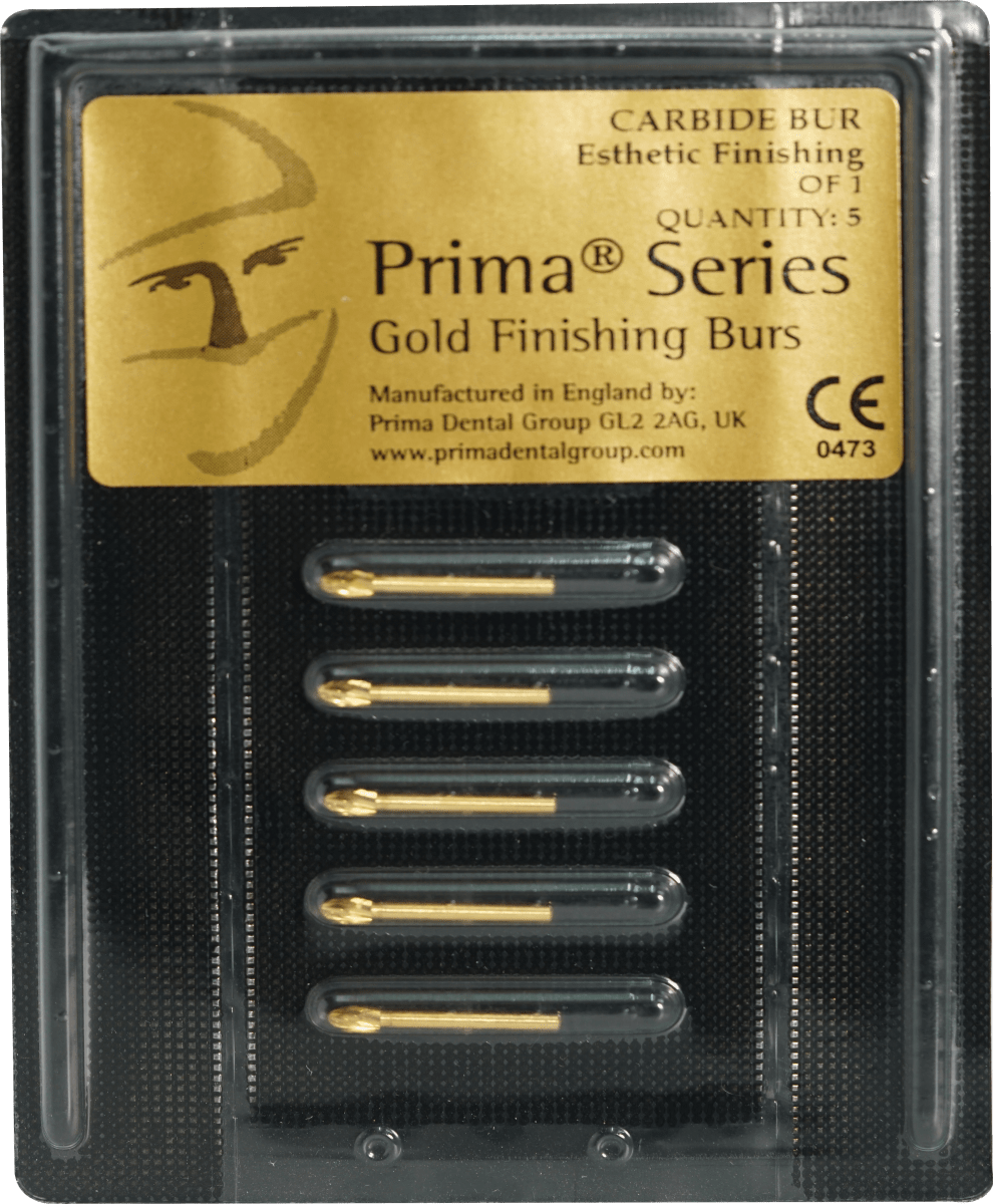 Prima® Gold Finishing Burs personifica la experiencia técnica y la ingeniería moderna con la que Prima Dental se ha asociado. Combinando las características de un vástago de acero inoxidable, cuello de carburo, carburo de grano fino y tolerancias estrechamente controladas, estos instrumentos de precisión proporcionan el equilibrio perfecto para recortar y terminar restauraciones. Un proceso de investigación y desarrollo detallados de dos años ha permitido a Prima Dental establecer la mejor forma, tamaño y ángulos de cuchilla para cada instrumento. El exclusivo chapado en oro significa su estatus premium como un producto de clase mundial. Acabado Estético 10/12-Blad Bur